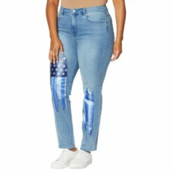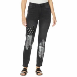 Celebrate yourfashionable freedom with America’s favorite wardrobe staple โฆ denim. These classic stretch denim skinny jeans feature an American flag-inspired foil print that adds colorful patriotism to your everyday look.