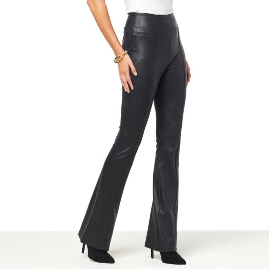 Low maintenance, high fashion.Made from a stretchy faux leather knit, these flattering, flared bootcut pantsbring effortless sophistication to your wardrobe.