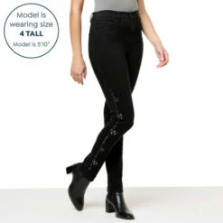 Curvy, cute and comfortably stretchy, this stylish essential is Diane’s Greatest Hit. The new classic stretch denim with embellisheddetail and a slim, full-length leghas a medium weight with great stretch and recovery for a lean and leggy look.