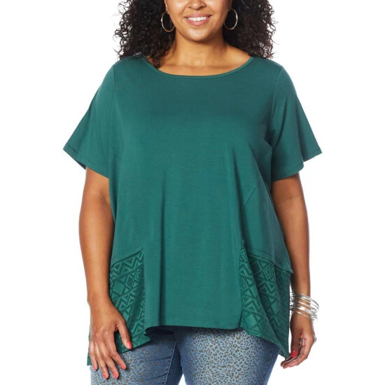 Woven eyelet godet sidepanels and an asymmetricsharkbite hem add standout style to this classic, short-sleevecotton knit tee from Diane Gilman.