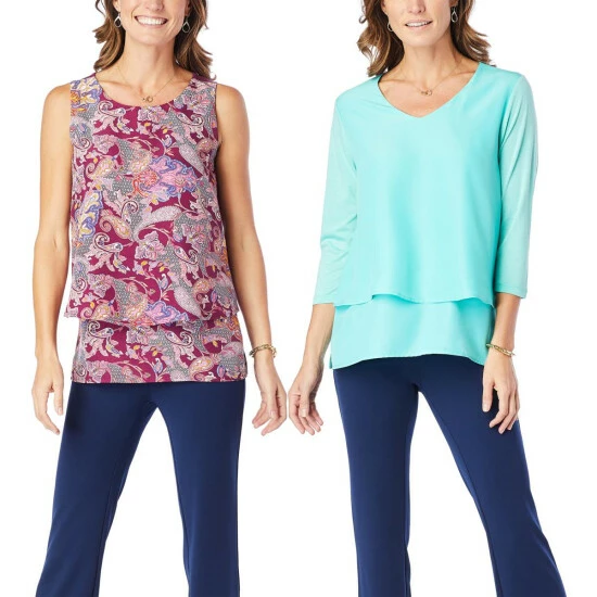 Diane Gilman’s best-selling Easy Tops now come in a two-pack set making it simple to layer and mix-and-match for a variety of seasonless looks.