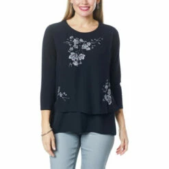 Wholesale ๐ DG2 By Diane Gilman 3/4-Sleeve Embroidered Easy Top Black ๐ฅฐ