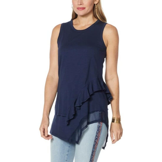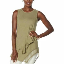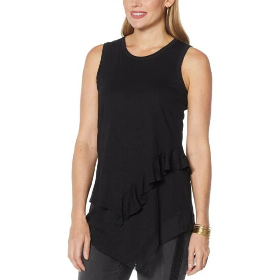 Get a standing ovation with this one! A double-layered, asymmetric hem withdetailed trimgives an unexpected, dramatic finish to this classicknit tank from Diane Gilman. Worn on its own or layered under a winter coat, it’s worthy of an encore.