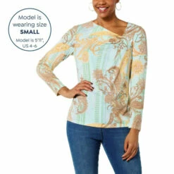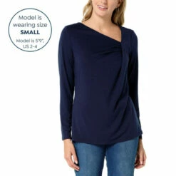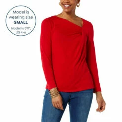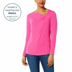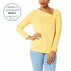 An asymmetric neckline adds a flirty finish to this super soft jersey knit top from Diane Gilman. It’s a timeless, seasonless wardrobe staple.