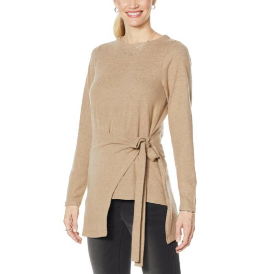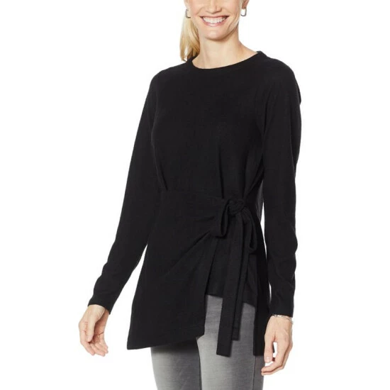 An asymmetric, tie-frontpanel wraps around the front of this brushed knit top creating a cinched, figure-flattering look you’ll love.