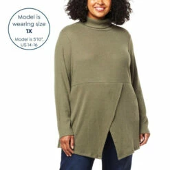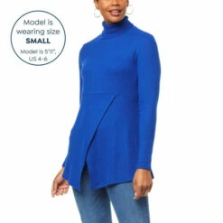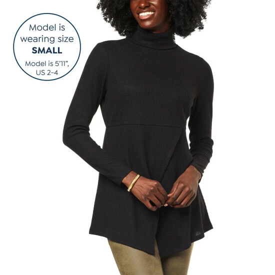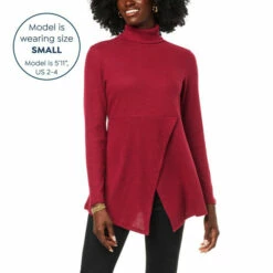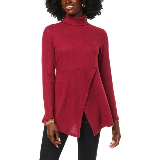 Fitted up top then flared at the hem in a pretty, cross-frontpeplum, this turtleneck topfeatures flattering detailsthrough the ribbing that draws the eye in and gives the illusion of a narrowed silhouette. Let your shape shine in skinnies or luxe leggings that match this top’s elegant shape.