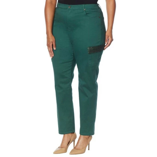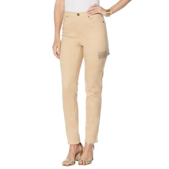 The season’s hottestutilitarian trend gets an elegant makeover with Diane Gilman’s brushed sateen dream fabric and sparkling sequin accents. The figure-flattering skinny cargo style in a classic jean silhouetteisa favorite for flatteringly functional year-round style.
