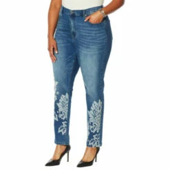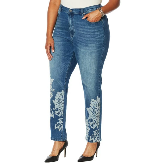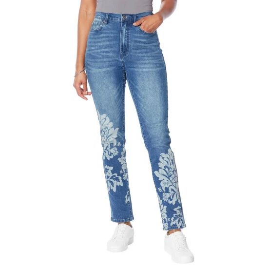 We gave Diane’s classicskinny jean a high-fashion makeover with statement-making floral print and sparkling rhinestoneaccents.