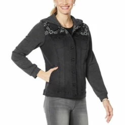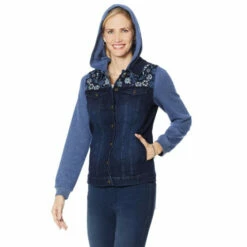 A classic jean jacket is a staple in any woman’s year-round wardrobe. This updatedversion from Diane Gilman features a hybrid design with fleece knit sleeves and a hood. Floral embroidery keeps it feminine and playful, while multiple pockets keep it fashionably functional.