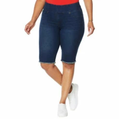 A frayed hem gives these denim Bermuda shorts a cut-off look that’s right on trend. But the best part may be the wide, stretch waistband offering all-day comfort.