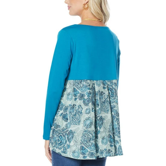 A full peplum sweep and printed sheer back paneladds dramatic dazzle to this classic long-sleeve top from Diane Gilman.