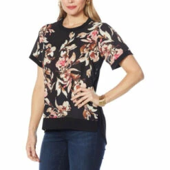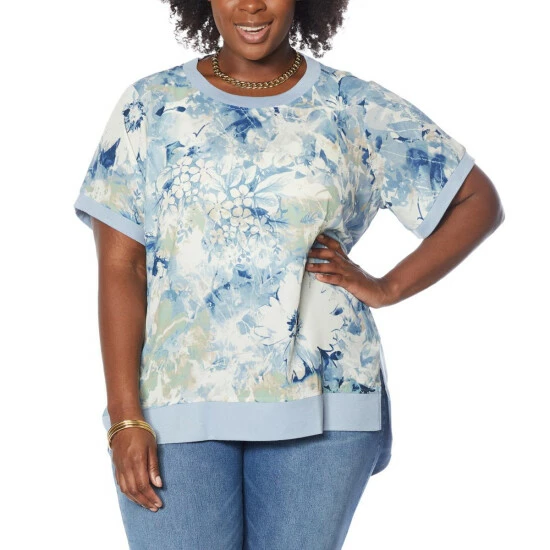 A chic,hi-lowhem and pretty printed frontpanel adds standout style to this classic everydaytee from Diane Gilman.