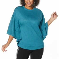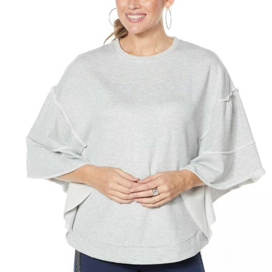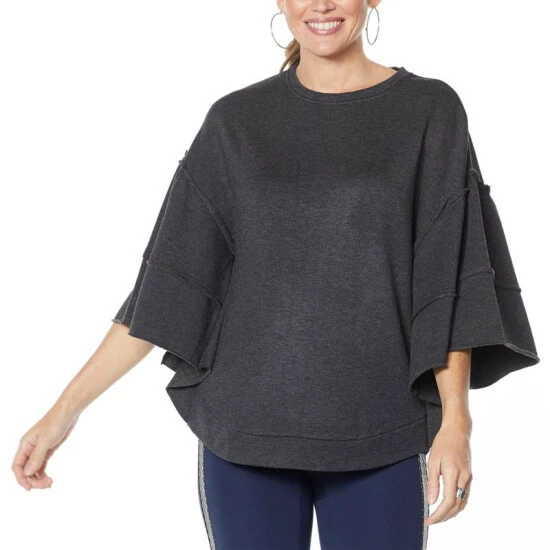 Sumptuously soft French terry knit and ruffled batwing sleeves give this classic topper an extraordinary edge for days, nights and weekends spent in stylish comfort.