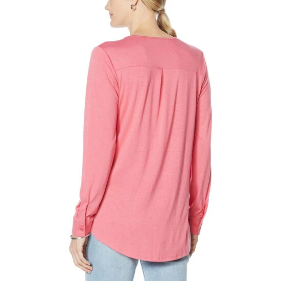 Artful draping, a back yoke with pleat and button cuffs come together in an elegant top that dresses up for any occasion.