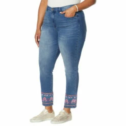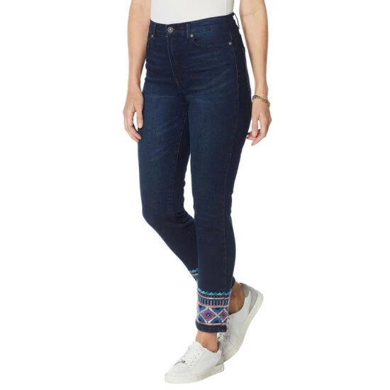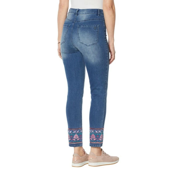 Embroidery draws the eye down to the eclectic hemlineof great-fitting ankle jeans made from classic stretch denim.