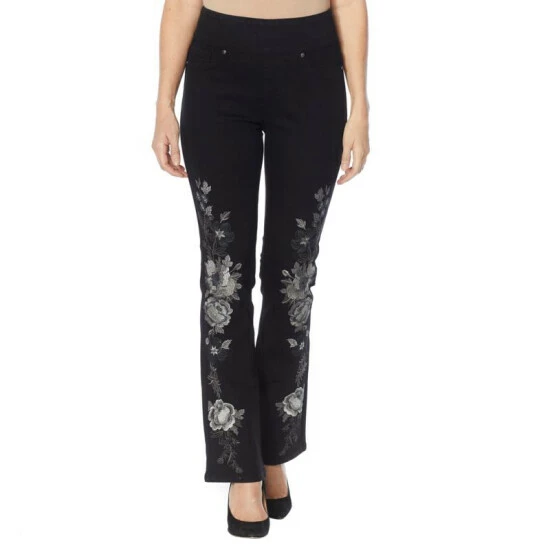Step aside, skinnies โ there’s a new jean in town. These classic stretch, pull-on jeansare slightly flared past the knee for a slim, boot-cutfitand bolstered with floral embroideryfor a fresh look.