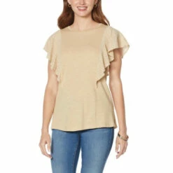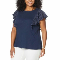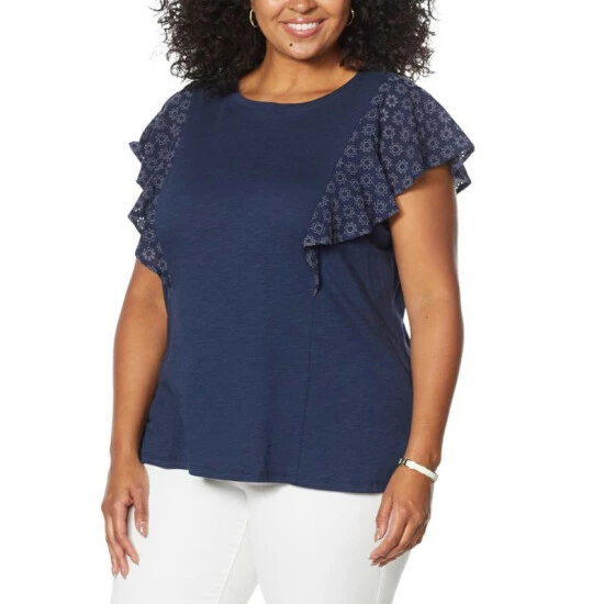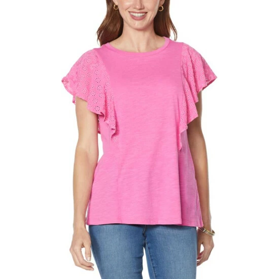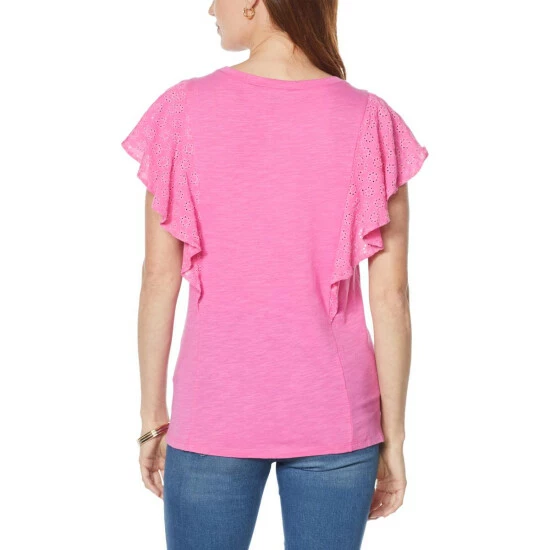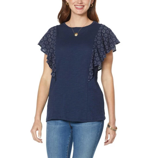 Pretty eyelet laceflutter sleevesdress up this casual slub knit tee so it can pull double duty for any desk-to-dinner look.