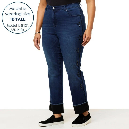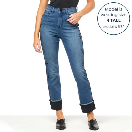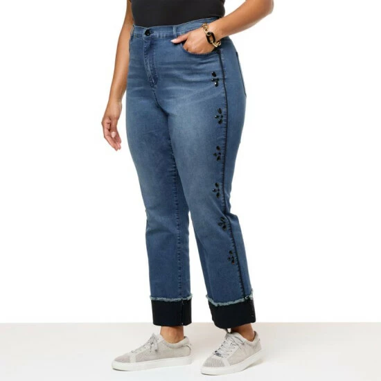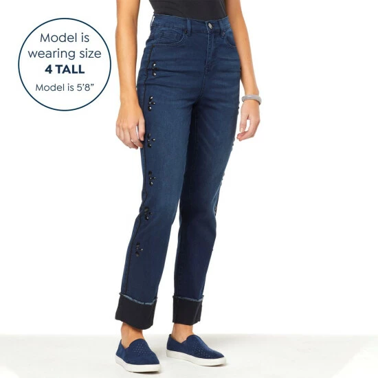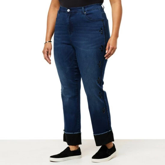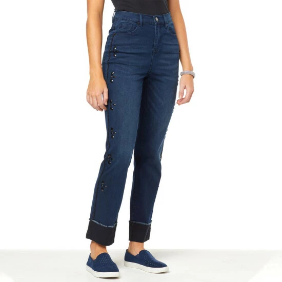 DG2 by Diane Gilman Flex Stretch Denim Jeweled Straight Ankle CuffedJean