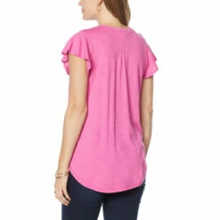 Your warm-weather uniform is here. A cool, cotton-blend knit and short flutter sleeves make this tee a perfect matchfor all your spring and summer bottoms.