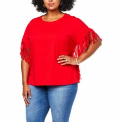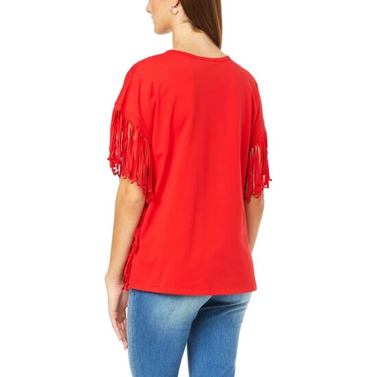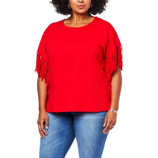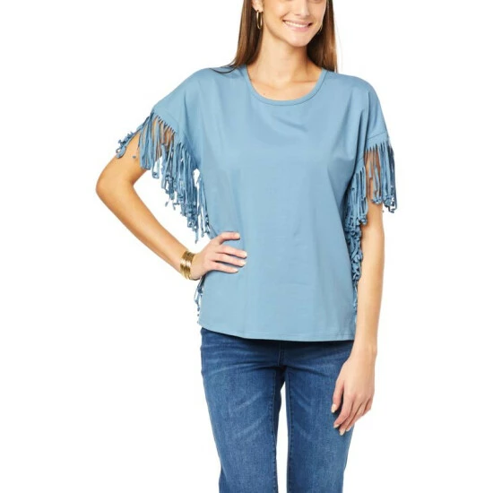 Fun fringe trims the side of this classic jersey knit tee, bringing a boho element to an otherwise casual, warm-weather style.