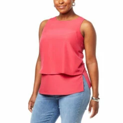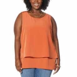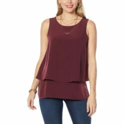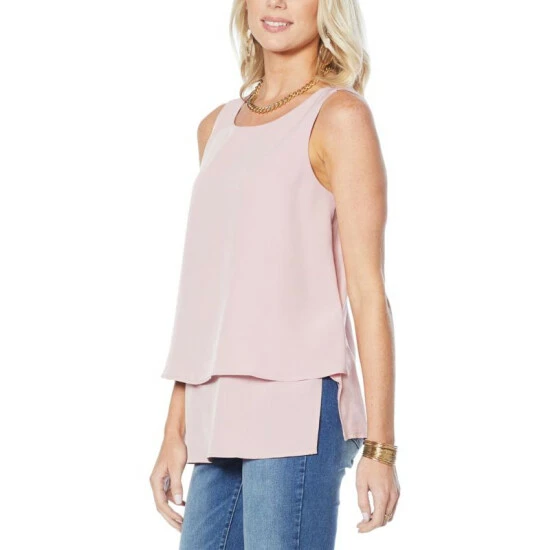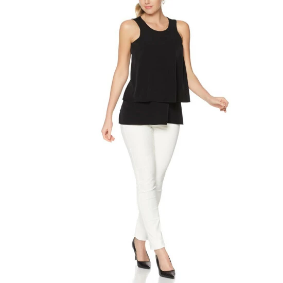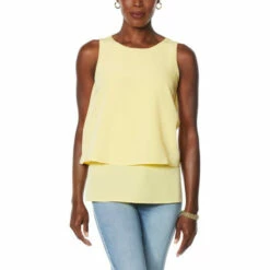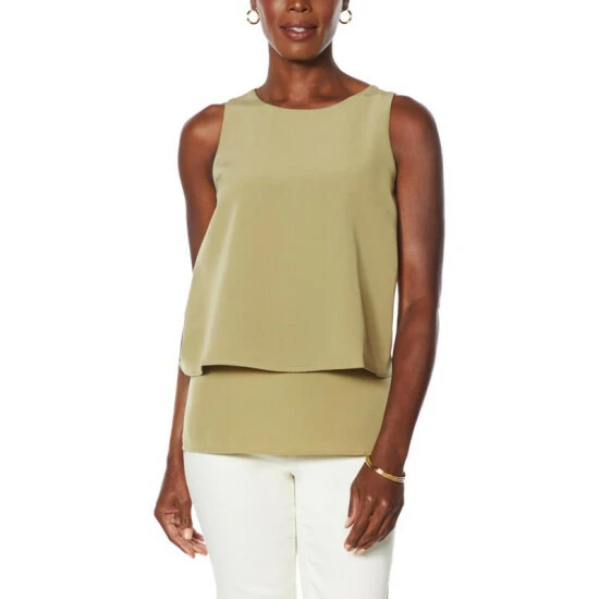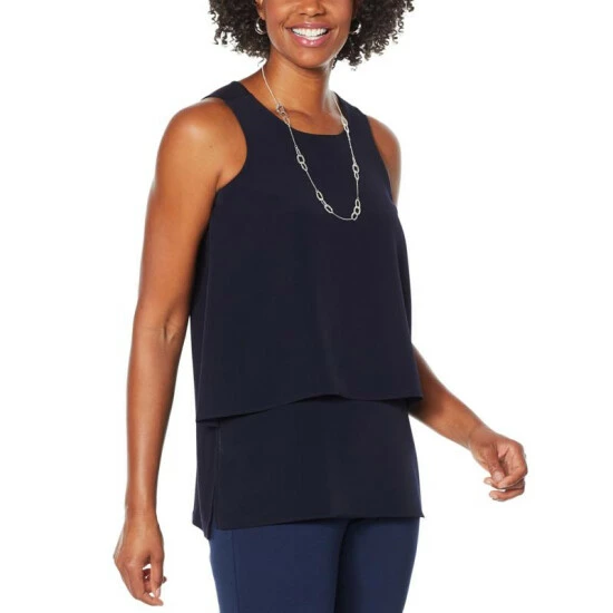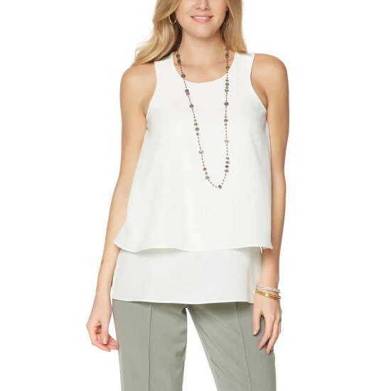 A dressy tank takes you from season to season. Worn alone or layered under a jacket, this mixed-media top features soft knit in back and two layers of crepe de chine in front. The perfect piece for now and later, day or night.