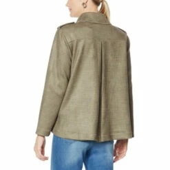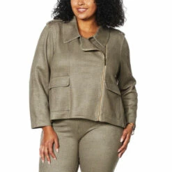 Soft, brushed knit fabric gives a casual feel to this classic cool moto-style jacket silhouette from Diane Gilman.