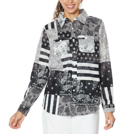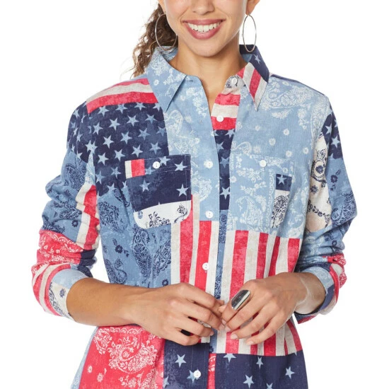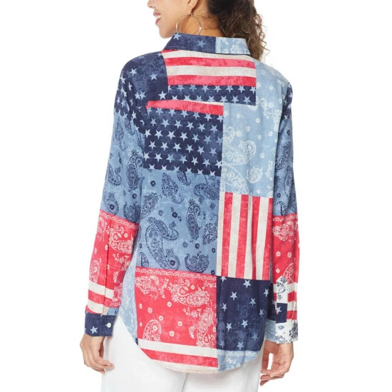 An eclectic mix of patterns add a chic, Boho look to this lightweight cotton blouse. Perfect for any season or occasion.