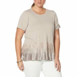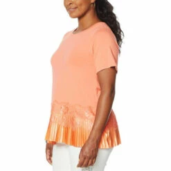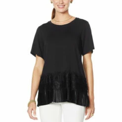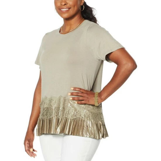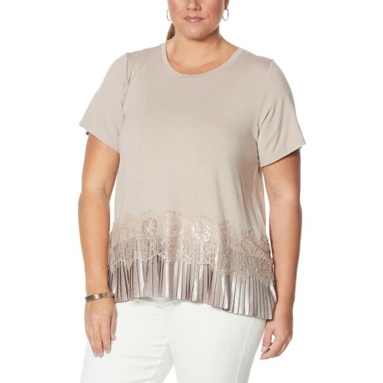 Opposites attract! This classic, stretch jerseyknit tee fashionably contradicts the polished high shine and feminine lace trim of the pleated peplum bottom on this must-have top from Diane Gilman.