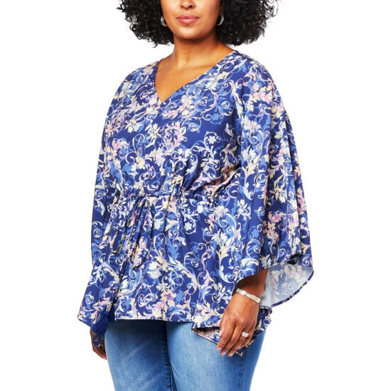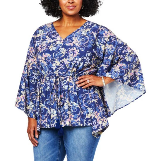 This RSVP-ready poncho top features a bold, beautiful print and a cinched tie waistsilhouette that both flatters the figureanddrapes beautifully over any fitted bottom in your wardrobe.