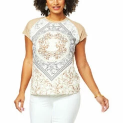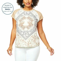 Luxe to a tee. This combo woven crepe and stretch knit top features a pretty, printed floral scarf-designed front that adds a touch of glamour to your everyday look.