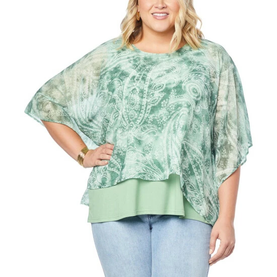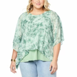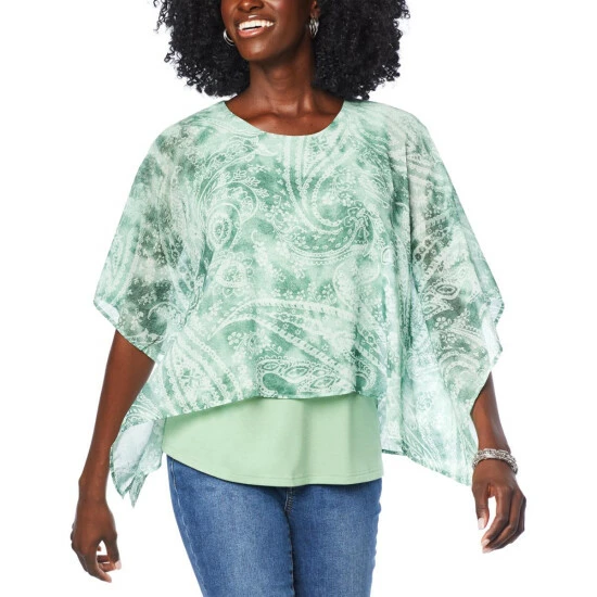 Dolman sleevesand a flowy, printedchiffon overlaygives thiselegantblouse afigure-flattering style to fit any body type.
