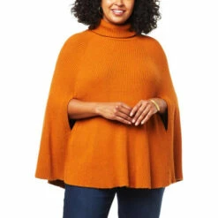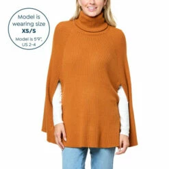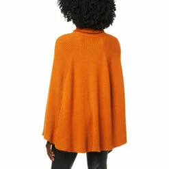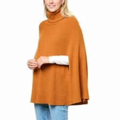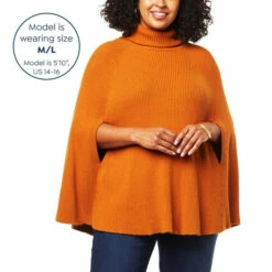 Flowing down from a cozy turtleneck, thisribbed knit sweaterflatters every inch to its full circlehem. Its roomy poncho silhouette offers added coziness, while the relaxed fit lets you easily layer itover any outfit.