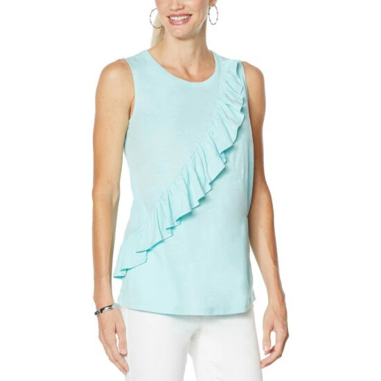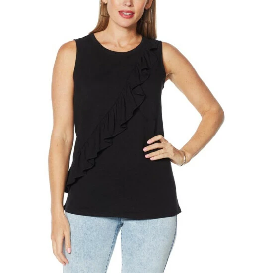 A flirty ruffled accentdresses up this casual slub knit tank so it can pull double duty for any desk-to-dinner look.