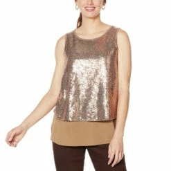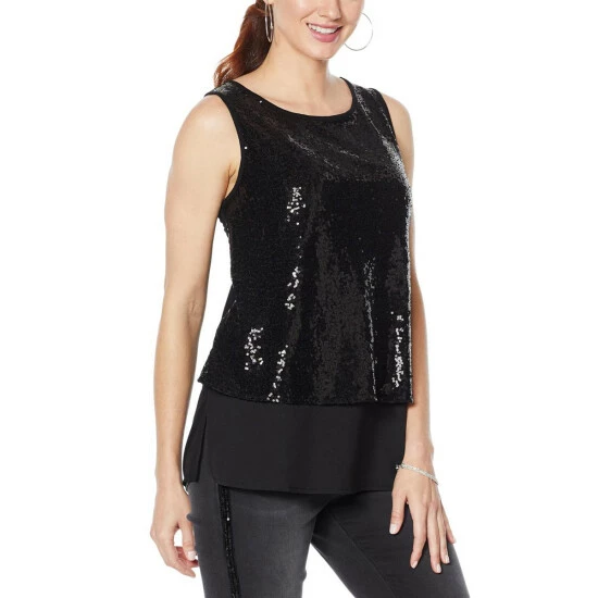The ever-popular easy tank gets a glam makeover for season! Sequins cover the top tier for a festive twist on this flattering style.