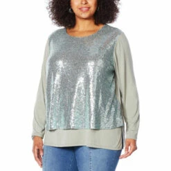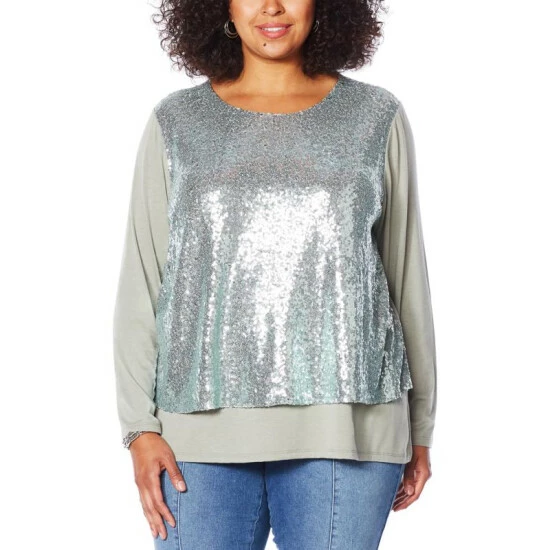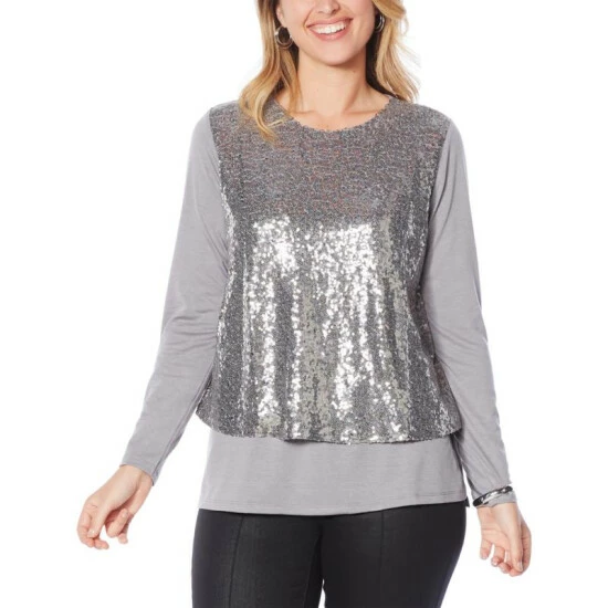 The ever-popular easy tank gets a glam makeover for season. Long sleeves to cover up for the weather and a sparkling sequin-covered top tier for a festive twist on this flattering, best-sellingstyle.