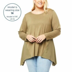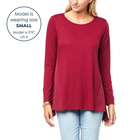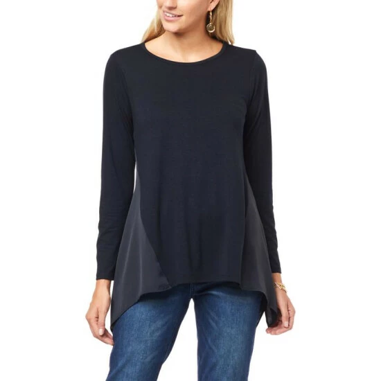 This casual and contemporary, woven/knit combotop in an accessory-friendly solid hue features classic details like long sleeves and a round neckline, while its asymmetric hemand scarf-like side panelsupgrade it to must-have wardrobe status.
