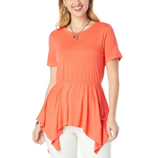 Getout-of-this-world comfort and style with this space-dyed knit peplum tee from Diane Gilman.