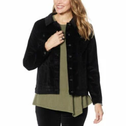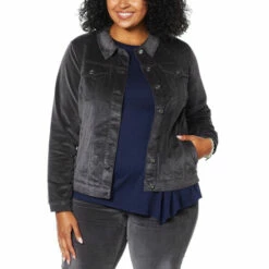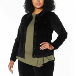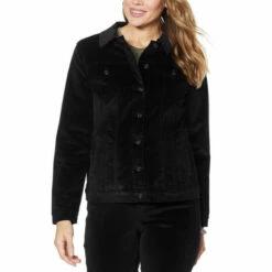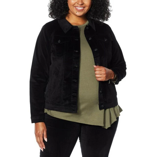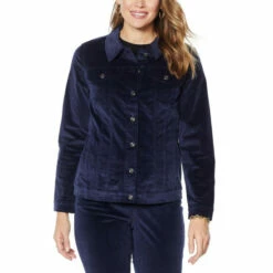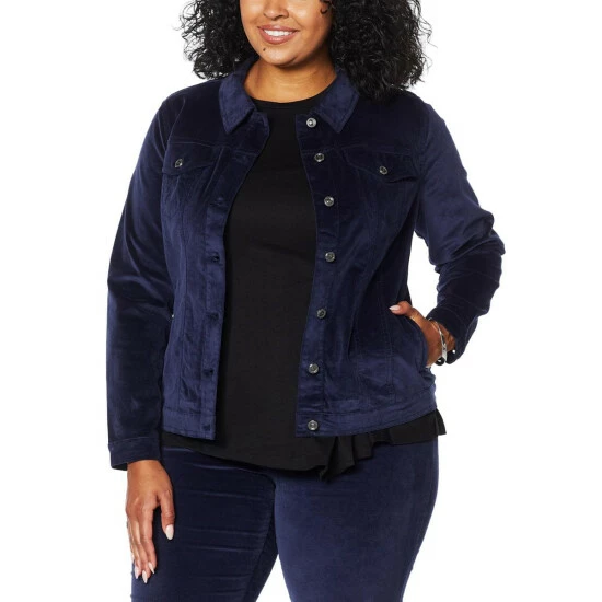 Score! A classic denim jacket silhouette in soft stretch velvet to pair with casual and dressy fashions.