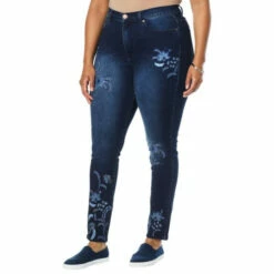 Curve-hugging, virtual stretchdenim provides a chic backdrop for the pretty floral-embroidered patterns on these classic skinny jeans from Diane Gilman.